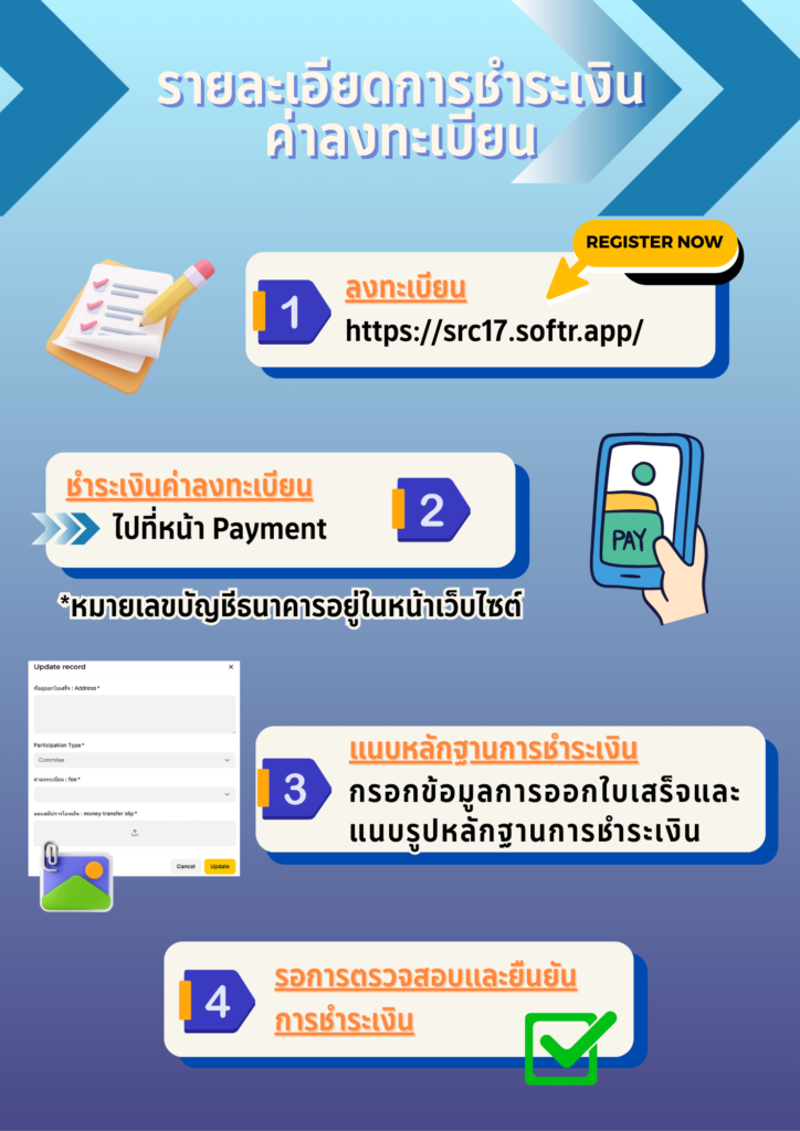 ผู้เข้าร่วมสามารถชำระค่าลงทะเบียน ณ จุดลงทะเบียนในวันจัดงาน